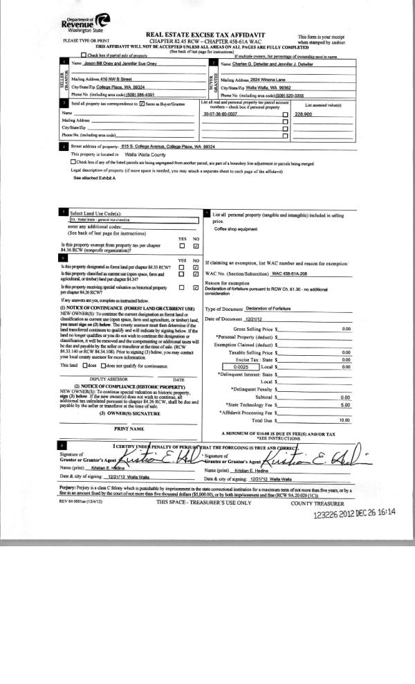 | 5 | 12/26/2012 | WARRANTY D | WARRANTY DEED | ONEY, JASON BILL & JENNIFER SU | DETWILER, CHARLES G & JENNIFER | | | $0.00 | 123226 | 2012-11556 |