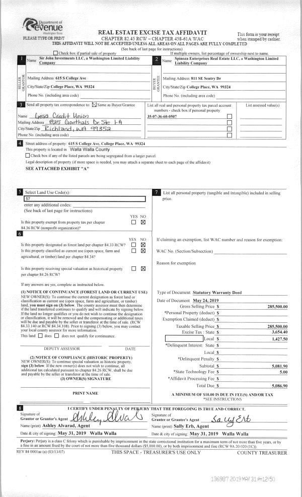| 2 | 05/31/2019 | SWD | STATUTORY WARRANTY DEED | SIR JOHN INVESTMENTS LLC | SPINOZA ENTERPRISES REAL ESTATE LLC | | | $285,500.00 | 136987 | 2019-03731 |