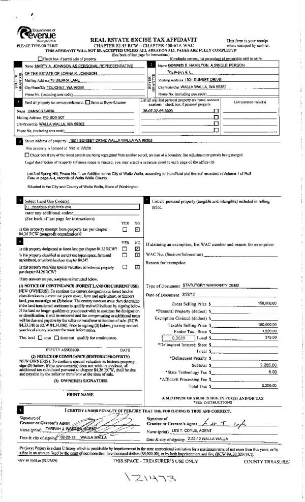 | 2 | 03/02/2012 | WARRANTY D | WARRANTY DEED | JOHNSON, LORNA K ESTATE OF | HAMILTON, DANIEL E | | | $150,000.00 | 121473 | 2012-01773 |