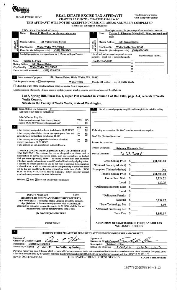 | 1 | 05/24/2018 | SWD | STATUTORY WARRANTY DEED | HAMILTON DANIEL E | FILAN TRISTAN L & MICHELLE D | | | $251,900.00 | 134779 | 2018-04117 |