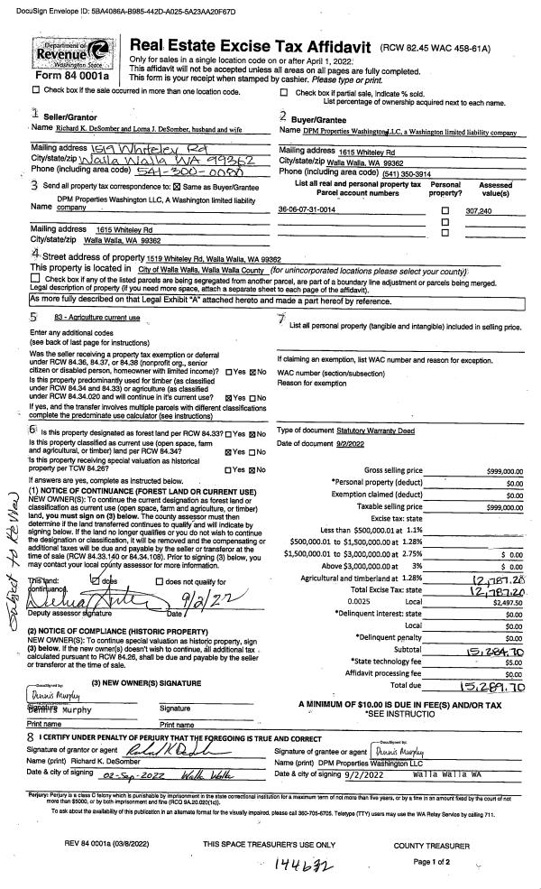 | 3 | 09/02/2022 | SWD | STATUTORY WARRANTY DEED | DESOMBER RICHARD K & LORNA J | DPM PROPERTIES WA2 LLC | | | $999,000.00 | 144632 | 2022-07421 |