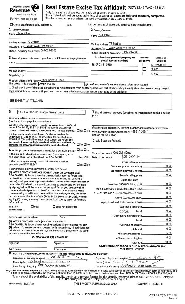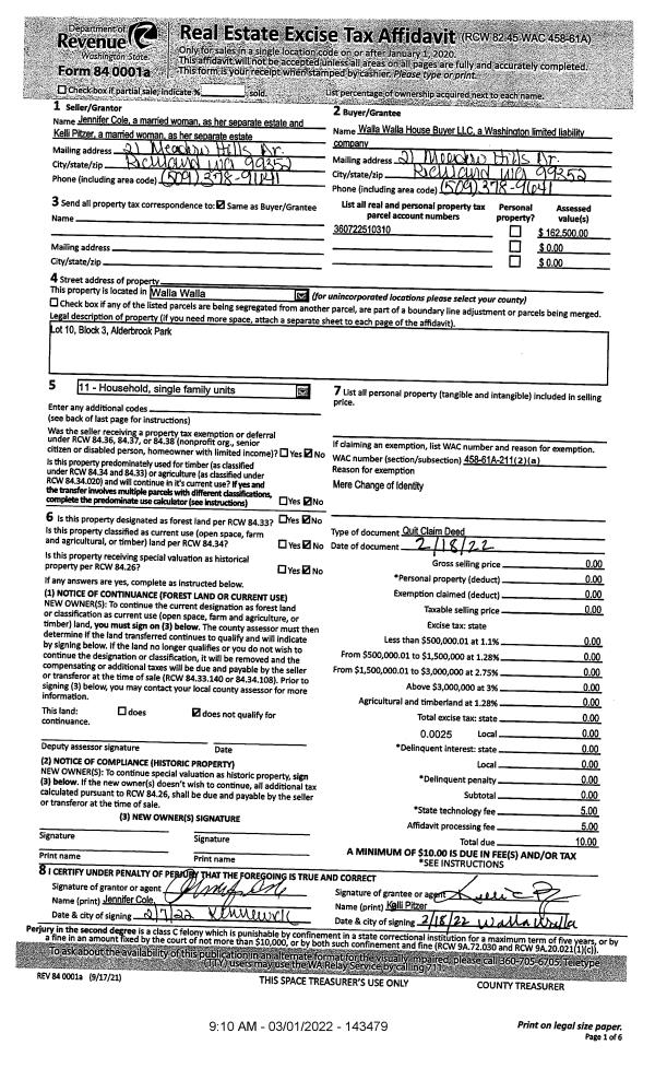 | 2 | 02/18/2022 | QCD | QUIT CLAIM DEED | PITZER KELLI | WALLA WALLA HOUSE BUYER LLC | | | $0.00 | 143479 | 2022-01783 |