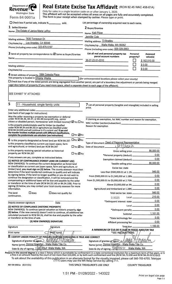 | 5 | 01/28/2022 | DPR | DEED OF PERSONAL REPRESENTATIVE | LEROY JANICE M | PITZER KELLI | | | $86,000.00 | 143322 | 2022-00892 |