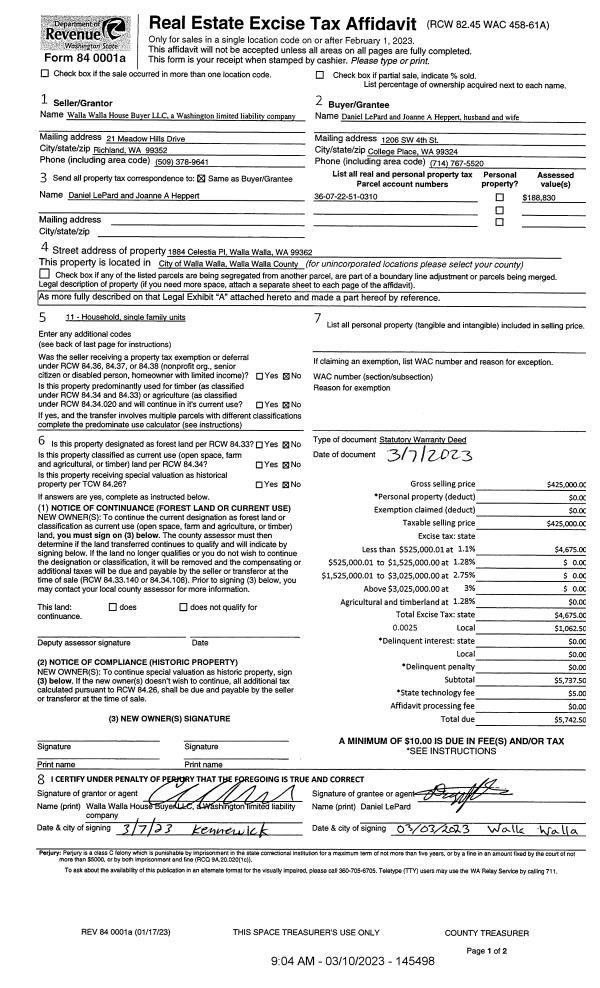 | 1 | 03/10/2023 | SWD | STATUTORY WARRANTY DEED | WALLA WALLA HOUSE BUYER LLC | LEPARD DANIEL & JOANNE A HEPPERT | | | $425,000.00 | 145498 | 2023-01228 |