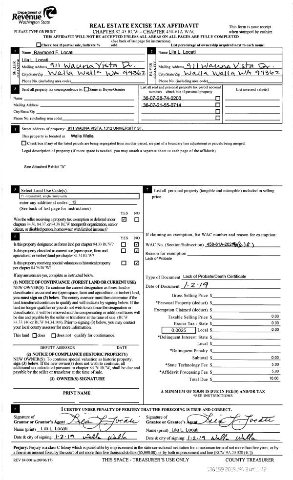 | 2 | 01/02/2019 | LOPA | LACK OF PROBATE AFFIDAVIT | LOCATI RAYMOND FRANCIS | LOCATI LILA L | | | $0.00 | 136199 | |