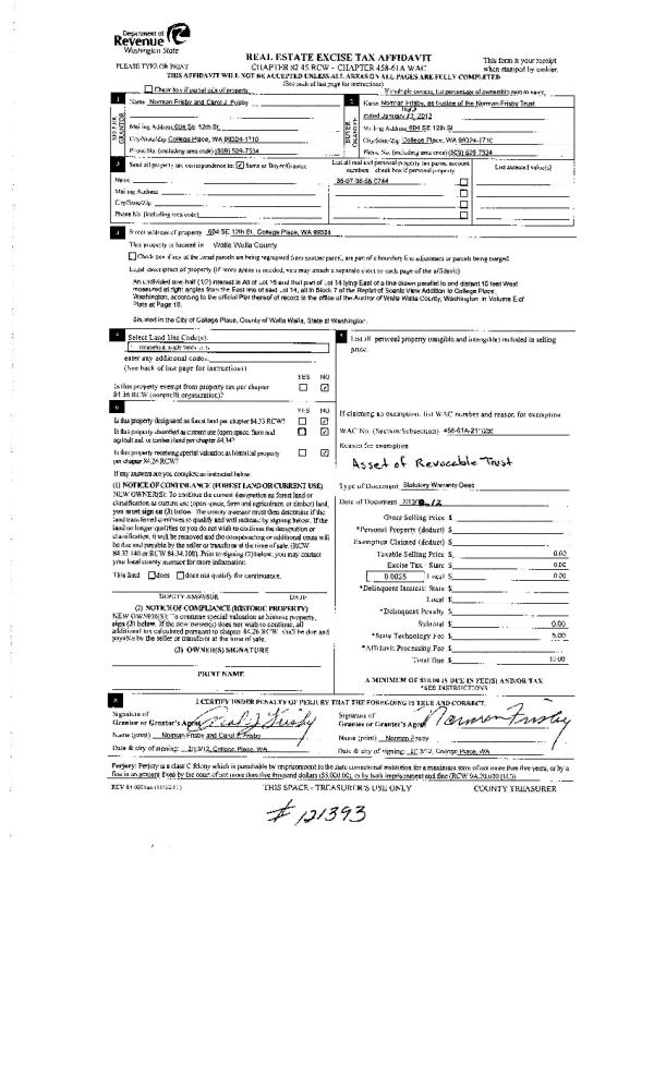 | 4 | 02/14/2012 | QCD | QUIT CLAIM DEED | FRISBY, NORMAN & CAROL J | FRISBY, NORMAN TRUST #53571 | | | | 121393 | 2012-01277 |