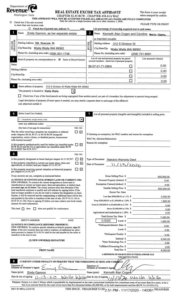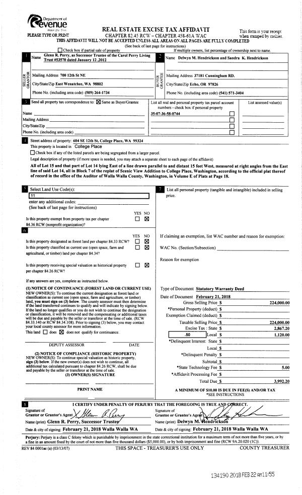 | 1 | 02/22/2018 | SWD | STATUTORY WARRANTY DEED | PERRY CAROL LIVING TRUST | HENDRICKSON DELWYN MARTIN & SANDRA KAY | | | $224,000.00 | 134190 | 2018-01468 |
