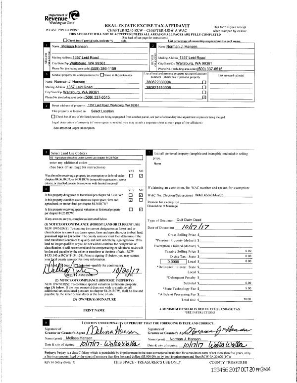 | 2 | 10/17/2017 | QCD | QUIT CLAIM DEED | HANSEN NORMAN J & MELISSA J | HANSEN NORMAN J | | | $0.00 | 133456 | 2017-08416 |