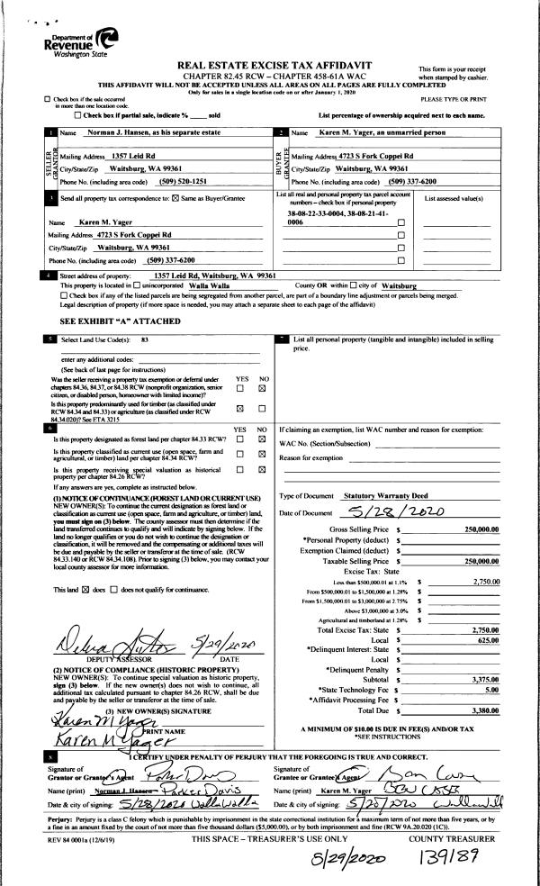 | 1 | 05/29/2020 | SWD | STATUTORY WARRANTY DEED | HANSEN NORMAN J | YAGER KAREN M | | 2-PARCELS | $250,000.00 | 139189 | 2020-04784 |