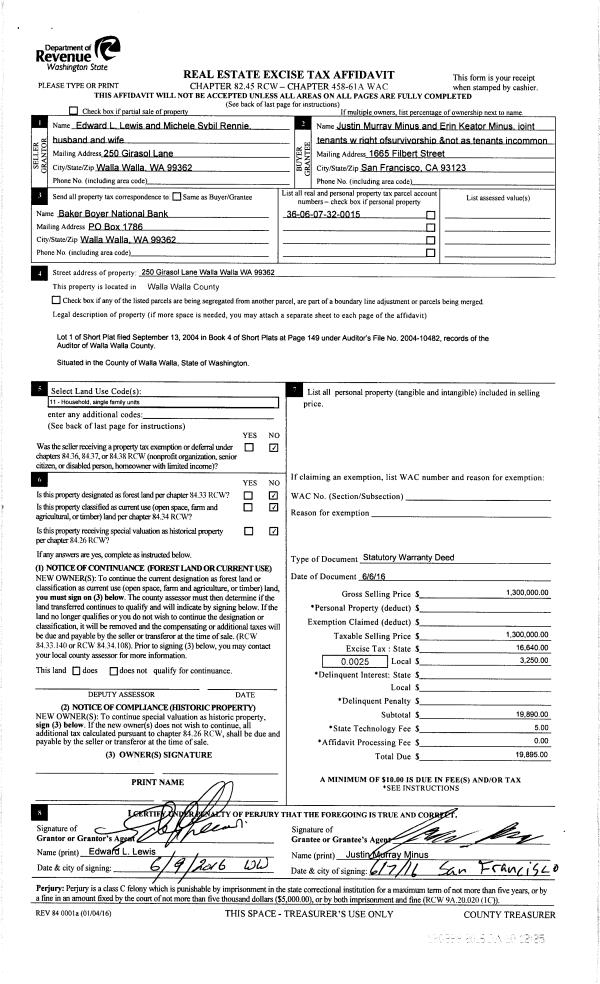 | 2 | 06/10/2016 | SWD | STATUTORY WARRANTY DEED | LEWIS EDWARD L | MINUS JUSTIN MURRAY & ERIN KEATOR | | | $1,300,000.00 | 130388 | 2016-04375 |
