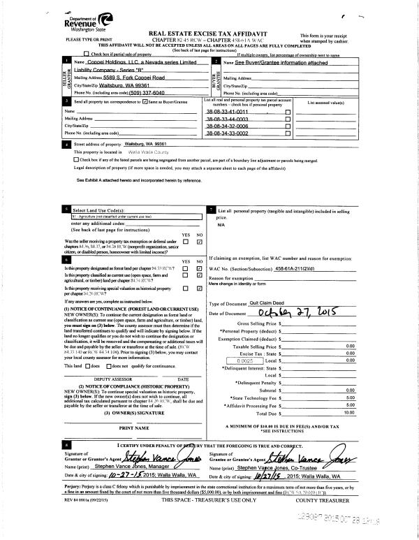 | 1 | 10/27/2015 | QCD | QUIT CLAIM DEED | COPPEI HOLDINGS LLC | JONES STEPHEN V & CINDY S REVOCABLE LIVING TRUST | 4 PARCELS | | | 129087 | 2015-09451 |
