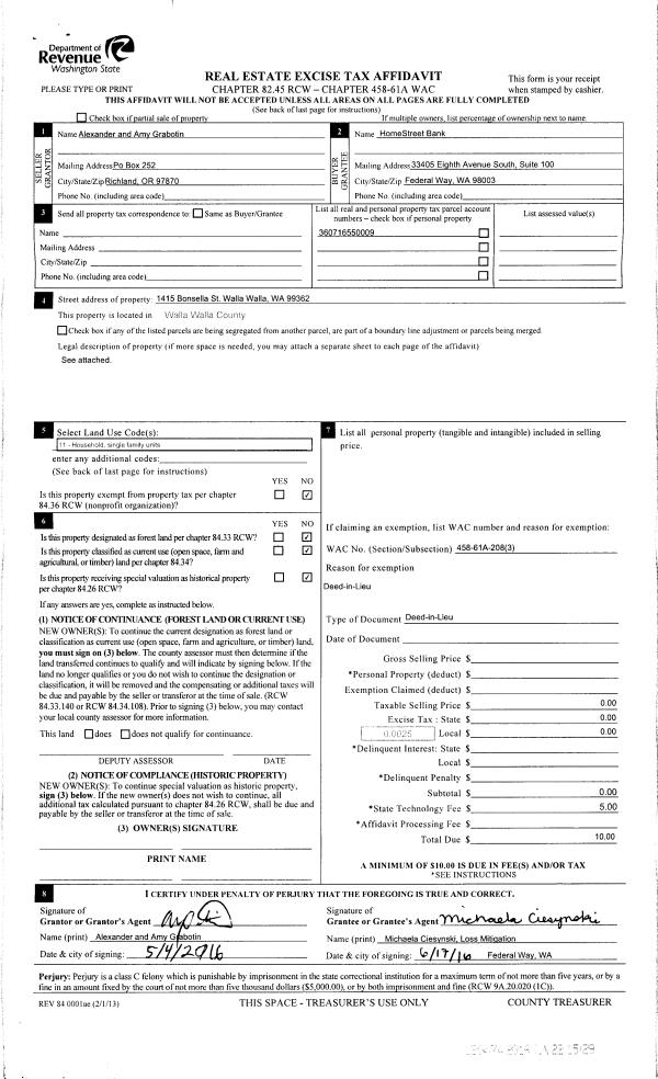 | 3 | 06/17/2016 | DFL | DEED IN LIEU OF FORECLOSURE | GRABOTIN ALEXANDER & AMY | HOMESTREET BANK | | | $0.00 | 130474 | 2016-04810 |
