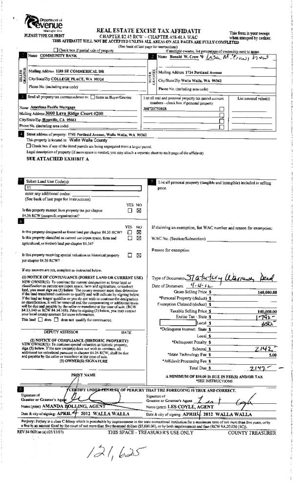 | Mailing Address: | 1741 PORTLAND AVE WALLA WALLA, WA 99362 | % Ownership: | 100.0000000000% |