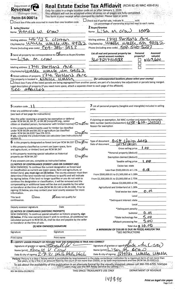 | 3 | 02/08/2021 | QCD | QUIT CLAIM DEED | CROW RONALD W & LISA M | CROW LISA M | | | $0.00 | 140895 | 2021-01591 |