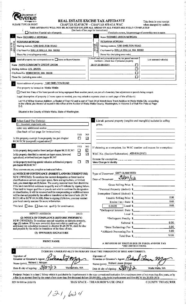 | 3 | 04/04/2012 | QCD | QUIT CLAIM DEED | MORGAN, RICHARD J & ROSANNA | MORGAN, RICHARD JASON & ROSANN | | | | 121624 | 2012-02713 |