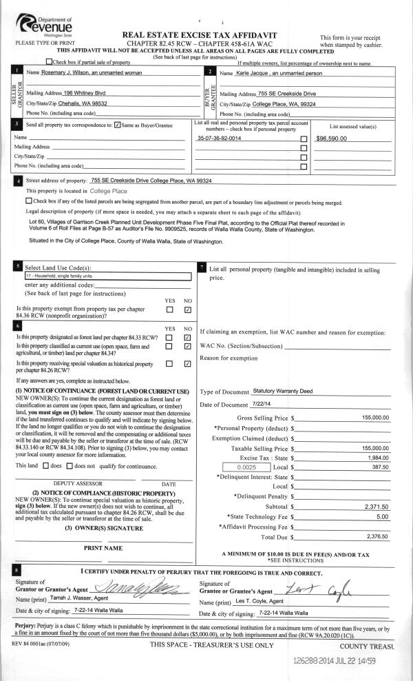 | 3 | 07/22/2014 | SWD | STATUTORY WARRANTY DEED | WILSON ROSEMARY J | JACQUE KARIE | | | $155,000.00 | 126288 | 2014-05139 |