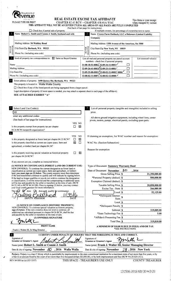 | 4 | 11/30/2016 | SWD | STATUTORY WARRANTY DEED | SMITH ROBERT L & CONNIE J | CROWN FARM OUTBACK LLC | | 9-PARCLES | $20,850,000.00 | 131506 | 2016-09810 |