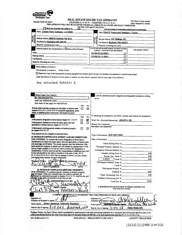 | 2 | 03/14/2018 | QCD | QUIT CLAIM DEED | CROWN FARM OUTBACK LLC | YOUNG CLINT R & HEATHER L | | | | 134308 | 2018-01990 |