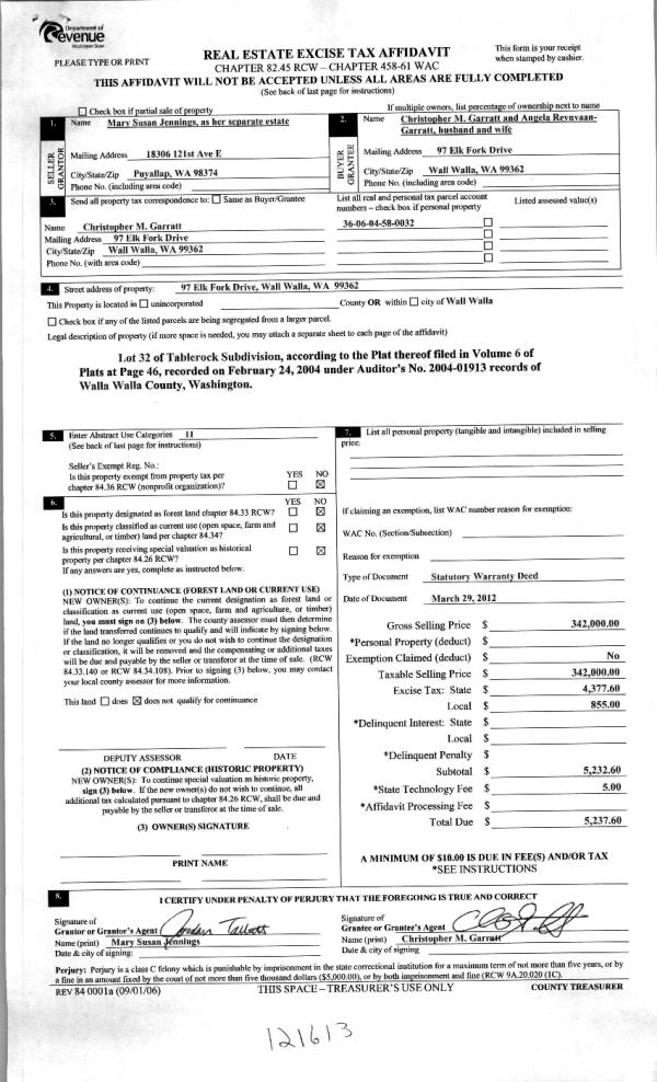 | Mailing Address: | ANGELA REYNVAAN-GARRATT 97 ELK FORK DR WALLA WALLA, WA 99362 | % Ownership: | 100.0000000000% |