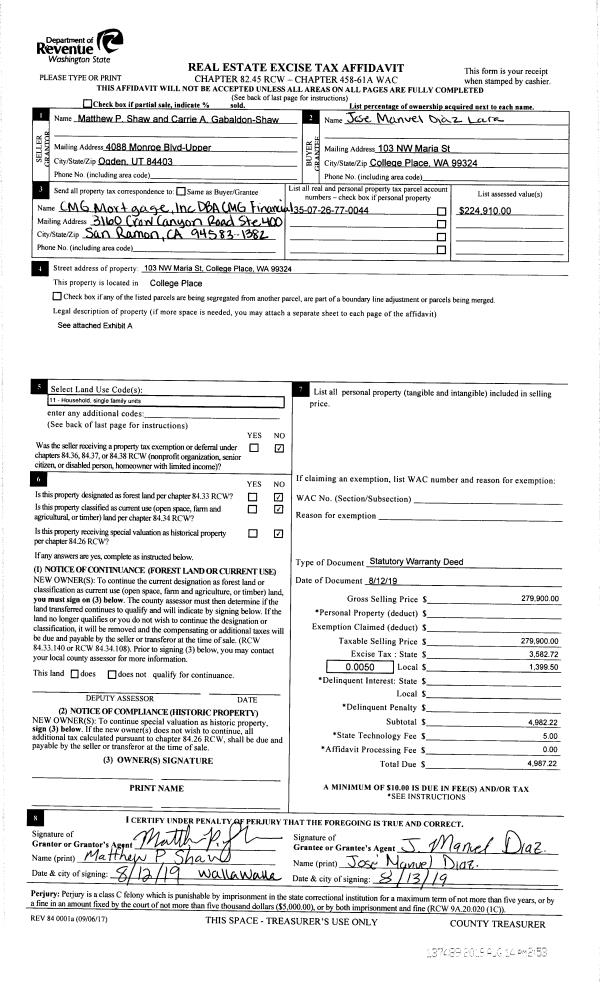 | 1 | 08/14/2019 | SWD | STATUTORY WARRANTY DEED | SHAW MATTHEW P | LARA JOSE MANUAL DIAZ | | | $279,900.00 | 137489 | 2019-06129 |