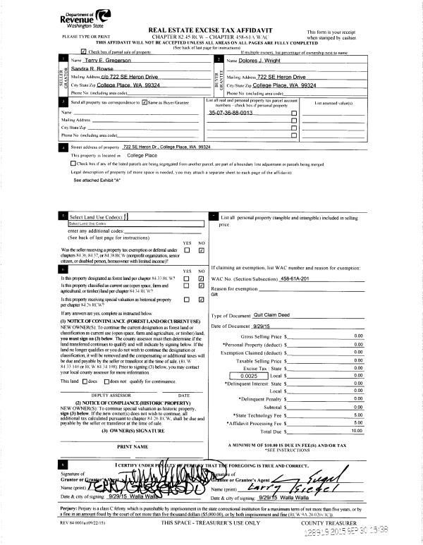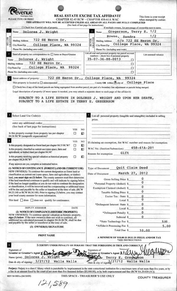 | 3 | 03/28/2012 | QCD | QUIT CLAIM DEED | WRIGHT, DOLORES J | GREGERSON, TERRY E UND 50% | | | | 121589 | 2012-02512 |