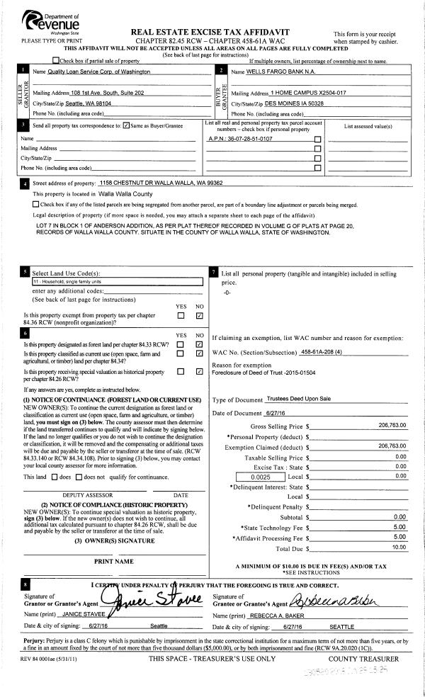 | Mailing Address: | VERONICA YVONNE WILLIAMS 1158 CHESTNUT DR WALLA WALLA, WA 99362 | % Ownership: | 100.0000000000% |