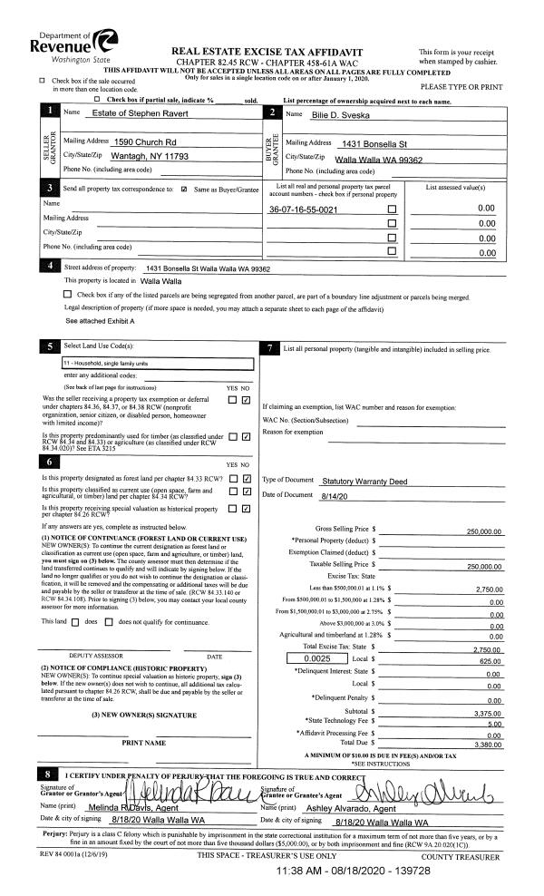 | 1 | 08/18/2020 | SWD | STATUTORY WARRANTY DEED | RAVERT STEPHEN A ESTATE OF | SVESKA BILLIE D | | | $250,000.00 | 139728 | 2020-08204 |
