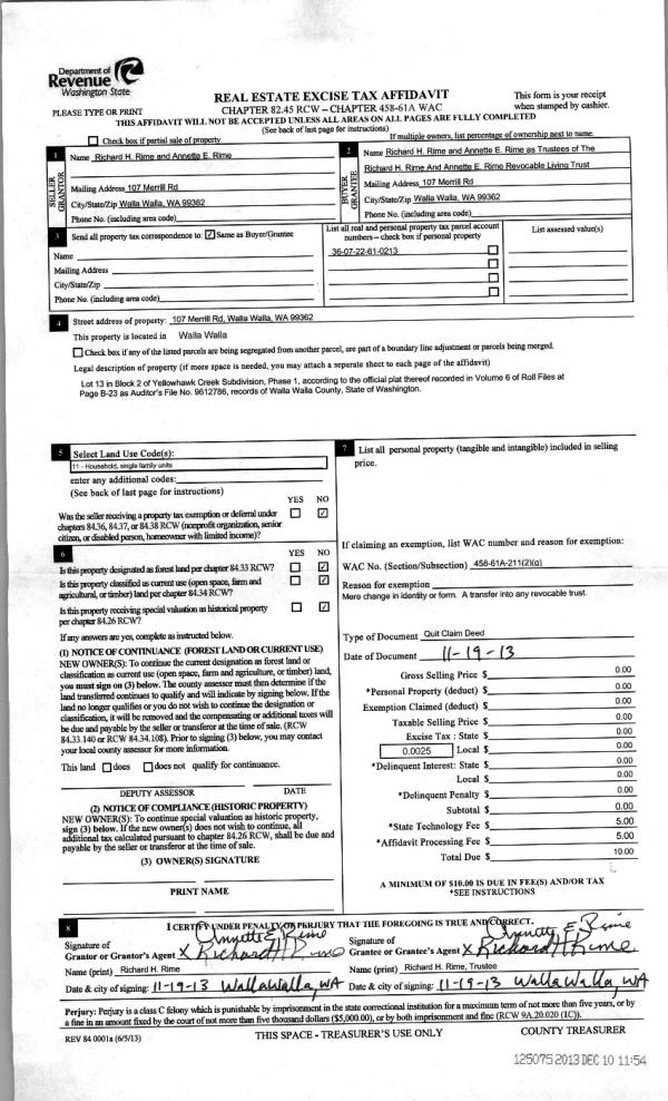 | 2 | 12/10/2013 | QCD | QUIT CLAIM DEED | RIME RICHARD & ANNETTE | RIME RICHARD H & ANNETTE E REVOCABLE LIVING TRUST | | | | 125075 | 2013-11824 |