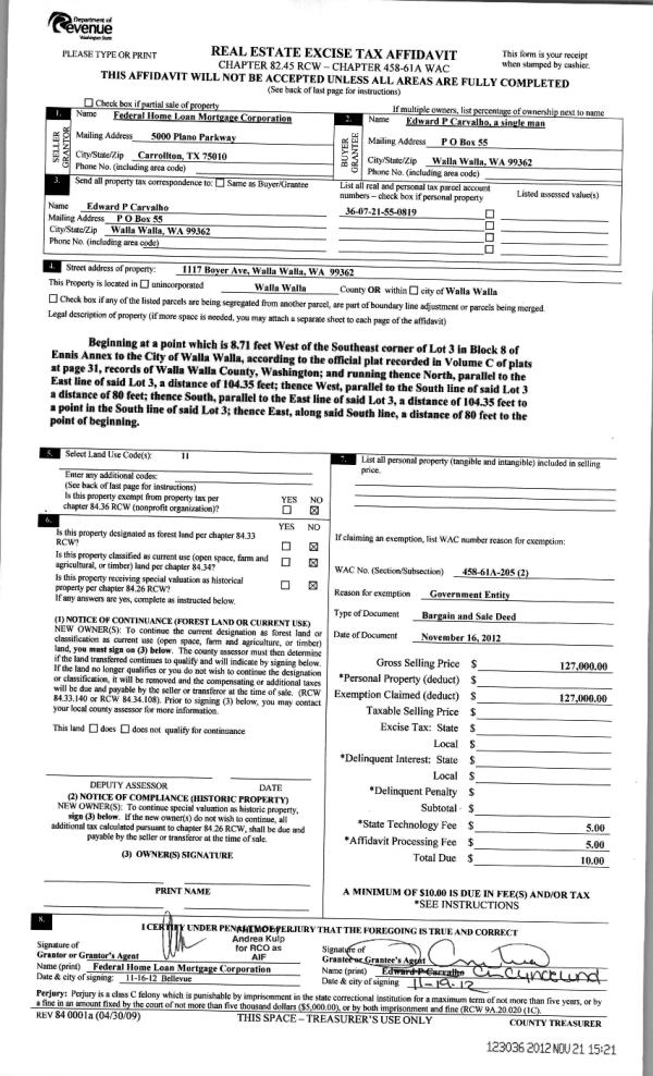 | 2 | 04/30/2012 | WARRANTY D | WARRANTY DEED | NORTHWEST TRUSTEE SERVICES INC | FEDERAL HOME LOAN MORTGAGE COR | | | $171,000.00 | 121731 | 2012-03398 |