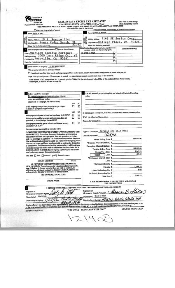 | 4 | 02/17/2012 | WARRANTY D | WARRANTY DEED | BRITT, BILLY B | HINER, GRACE E | | | $199,000.00 | 121408 | 2012-01376 |