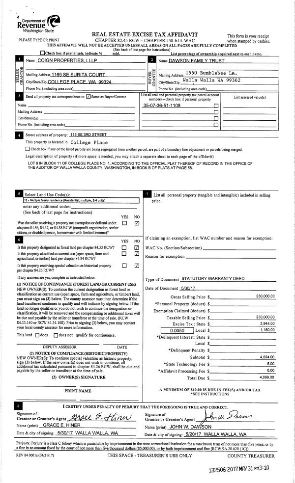 | 1 | 05/31/2017 | SWD | STATUTORY WARRANTY DEED | COIGN PROPERTIES LLLP | DAWSON FAMILY TRUST | | | $230,000.00 | 132506 | 2017-04145 |