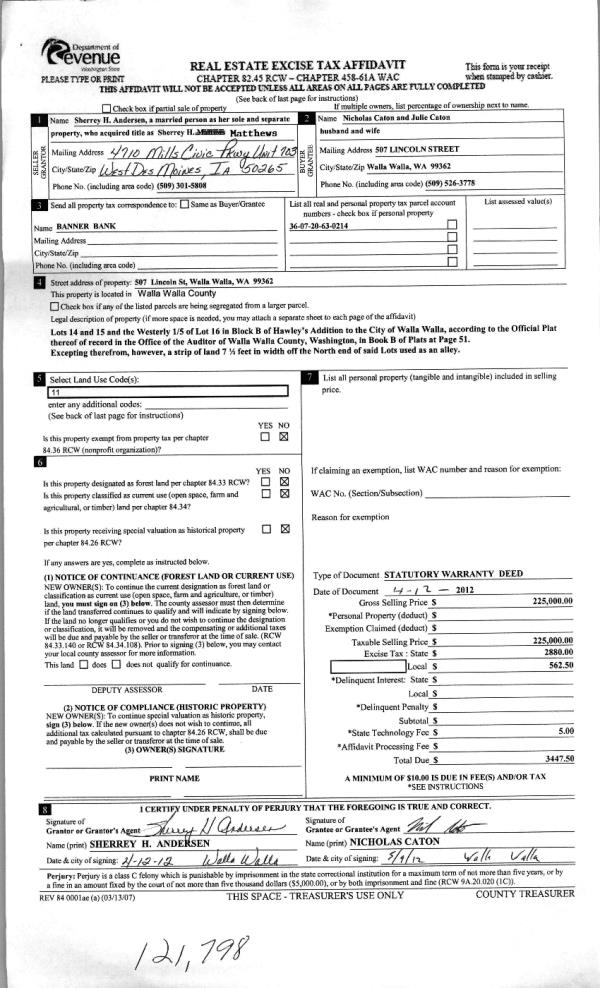 | 2 | 06/01/2012 | WARRANTY D | WARRANTY DEED | ANDERSEN, SHERREY H | CATON, NICHOLAS & JULIE | | | | 121915 | 2012-04547 |