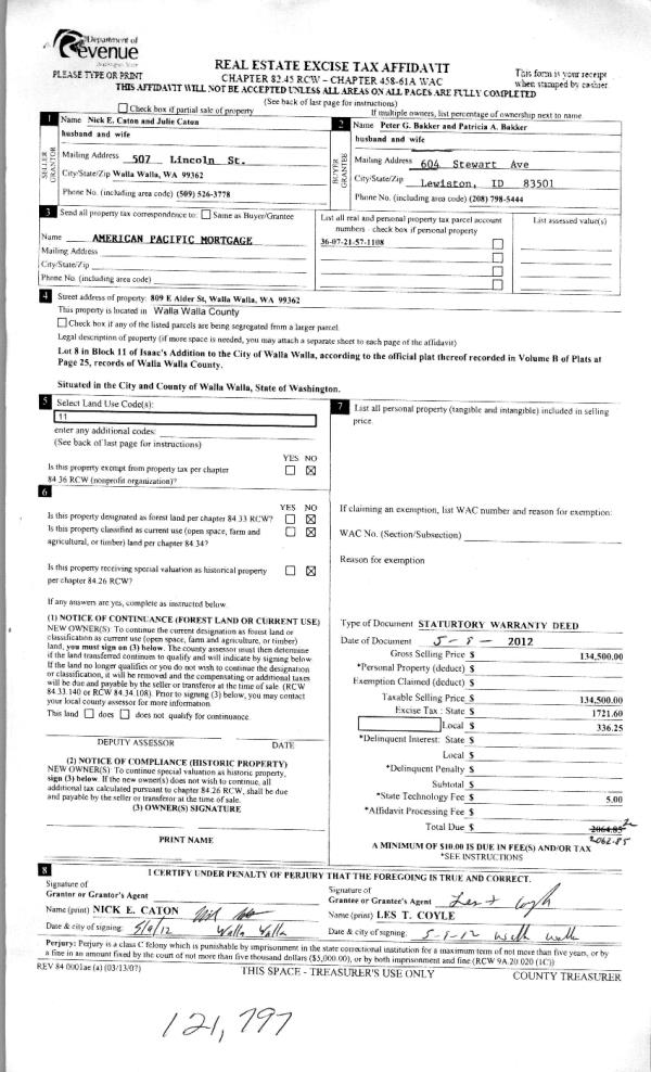 | 2 | 05/11/2012 | WARRANTY D | WARRANTY DEED | CATON, NICK E & JULIE | BAKKER, PETER G & PATRICIA A | | | $134,500.00 | 121797 | 2012-03865 |