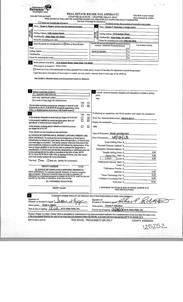 | 4 | 01/10/2014 | BARGAIN & | BARGAIN & SALE DEED | EGGERS SUSAN A | ROBERTSON CHARLES P | | | | 125252 | 2014-00212 |