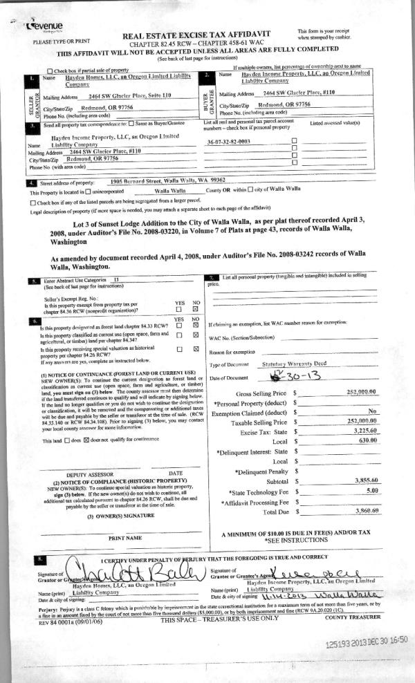 | 1 | 12/30/2013 | WARRANTY D | WARRANTY DEED | HAYDEN HOMES LLC | HAYDEN INCOME PROPERTY LLC | | | $252,000.00 | 125193 | 2013-12359 |