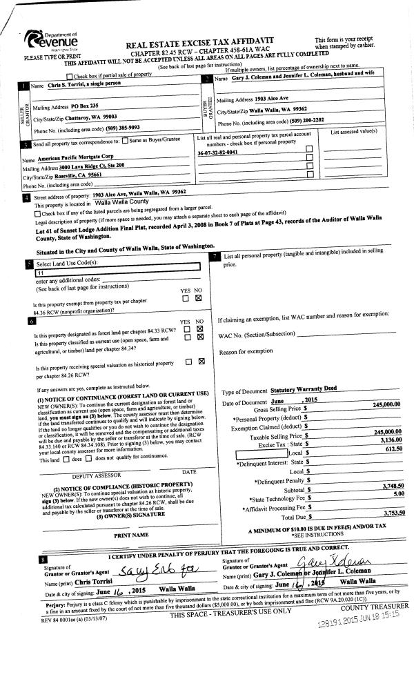 | 3 | 06/18/2015 | SWD | STATUTORY WARRANTY DEED | TORRISI CHRIS S | COLEMAN GARY J & JENNIFER L | | | $245,000.00 | 128191 | 2015-05134 |