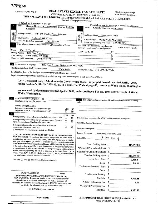 | 5 | 03/04/2014 | SWD | STATUTORY WARRANTY DEED | HAYDEN HOMES LLC | TORRISI CHRIS S | | | $219,990.00 | 125518 | 2014-01507 |