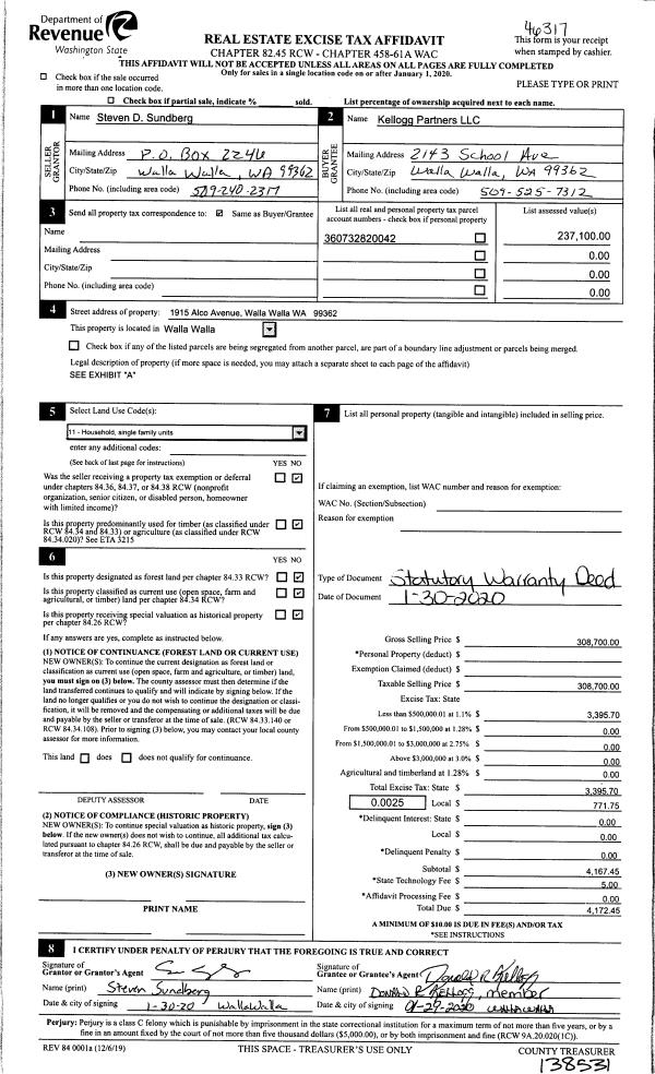 | 2 | 01/31/2020 | SWD | STATUTORY WARRANTY DEED | SUNDBERG STEVEN D | KELLOGG PARTNERS LLC | | | $308,700.00 | 138531 | 2020-00928 |