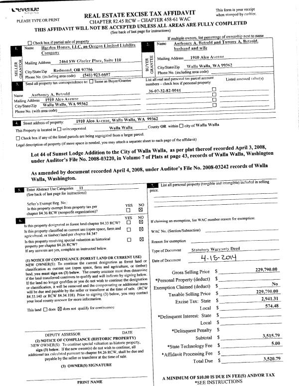 | 3 | 04/24/2014 | SWD | STATUTORY WARRANTY DEED | HAYDEN HOMES LLC | BETZOLD ANTHONEY A & TAMMY A | | | $229,790.00 | 125759 | 2014-02769 |