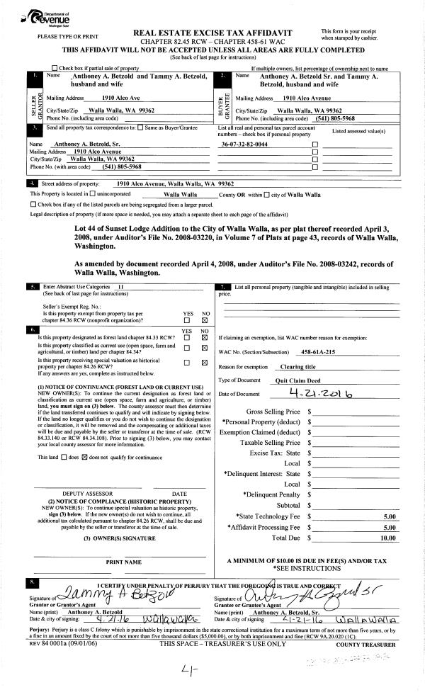 | 2 | 04/21/2016 | QCD | QUIT CLAIM DEED | BETZOLD ANTHONEY A & TAMMY A | BETZOLD ANTHONEY A SR & TAMMY A | | | | 130094 | 2016-03064 |
