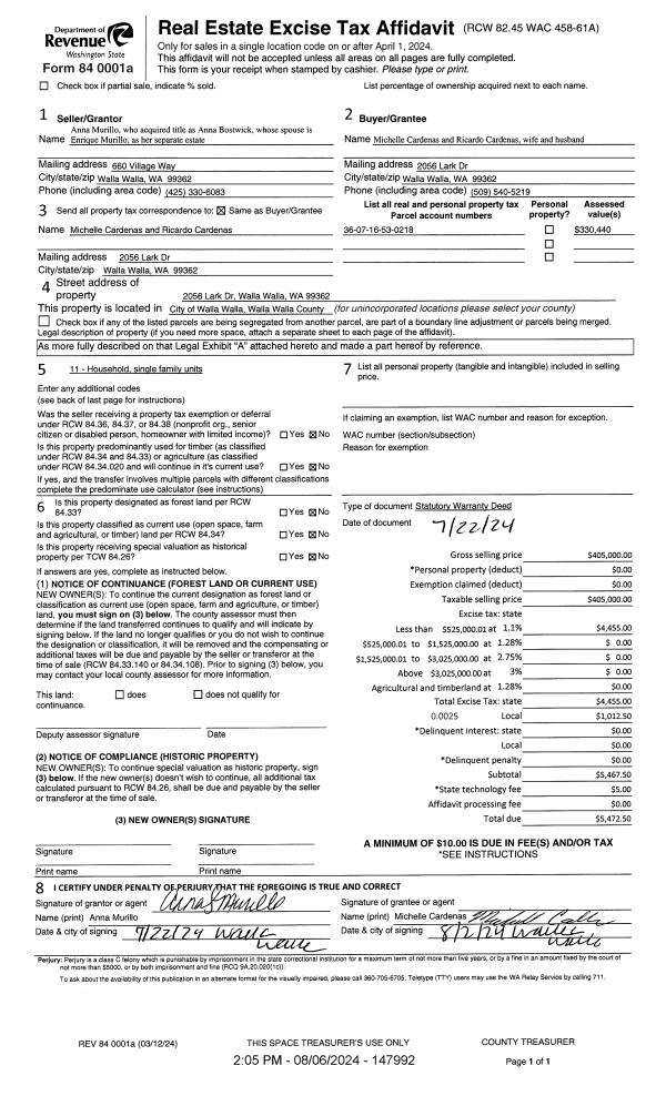 | 1 | 08/06/2024 | SWD | STATUTORY WARRANTY DEED | BOSTWICK ANNA | CARDENAS MICHELLE & RICARDO | | | $405,000.00 | 147992 | 2024-04323 |