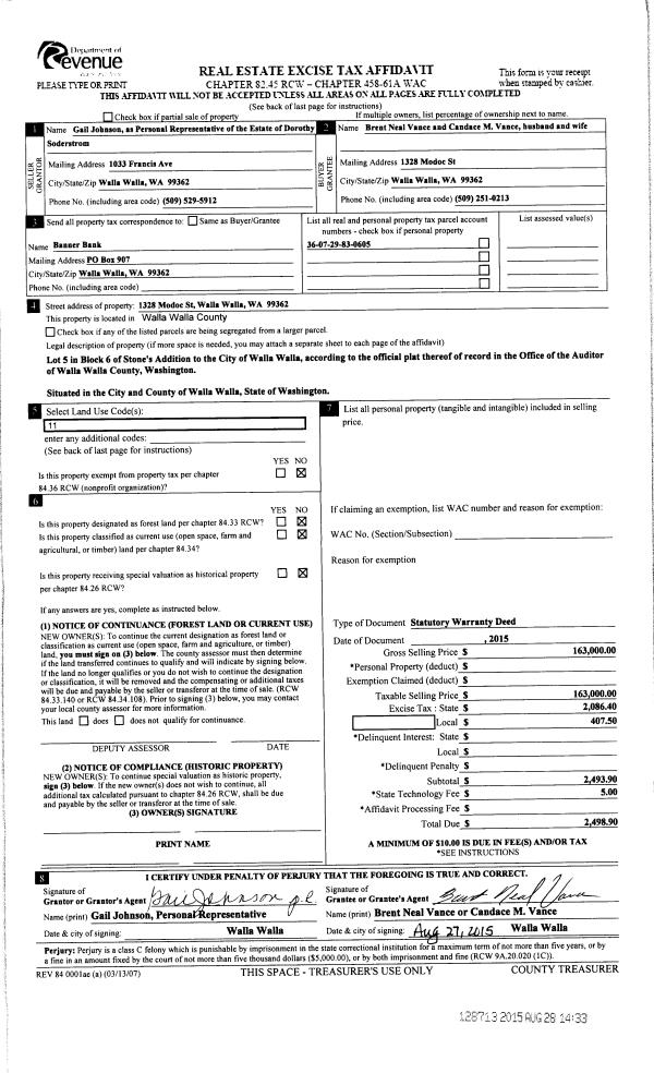 | 2 | 08/28/2015 | SWD | STATUTORY WARRANTY DEED | SODERSTROM DOROTHY E ESTATE OF | VANCE BRENT NEAL & CANDACE M | | | $163,000.00 | 128713 | 2015-07577 |