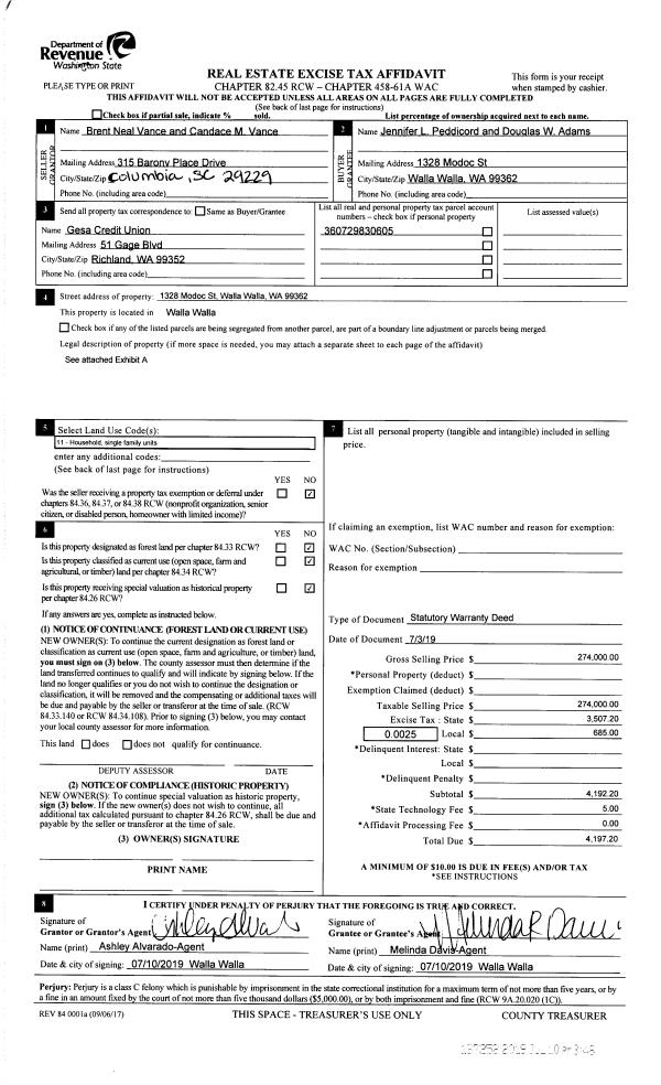 | 1 | 07/10/2019 | SWD | STATUTORY WARRANTY DEED | VANCE BRENT NEAL & CANDACE M | ADAMS DOUGLAS W | | | $274,000.00 | 137252 | 2019-04938 |