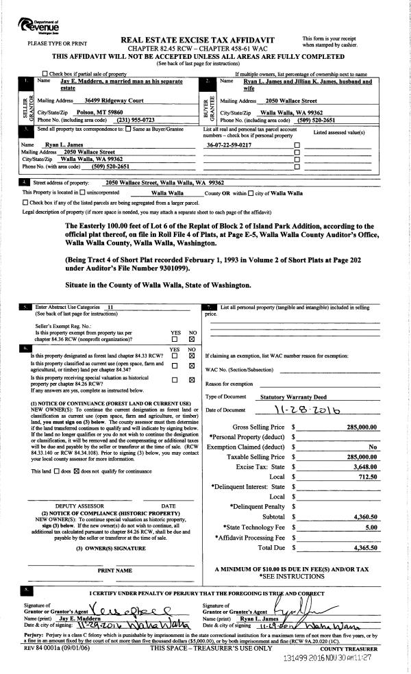 | 2 | 11/30/2016 | SWD | STATUTORY WARRANTY DEED | MADDERN JAY E | JAMES RYAN L & JILLIAN K | | | $285,000.00 | 131499 | 2016-09790 |