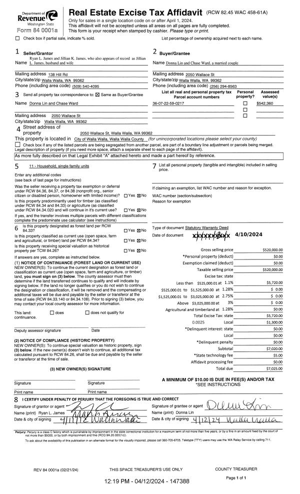 | 1 | 04/12/2024 | SWD | STATUTORY WARRANTY DEED | JAMES RYAN L & JILLIAN K | LIN DONNA & CHASE WARD | | | $520,000.00 | 147388 | 2024-01818 |