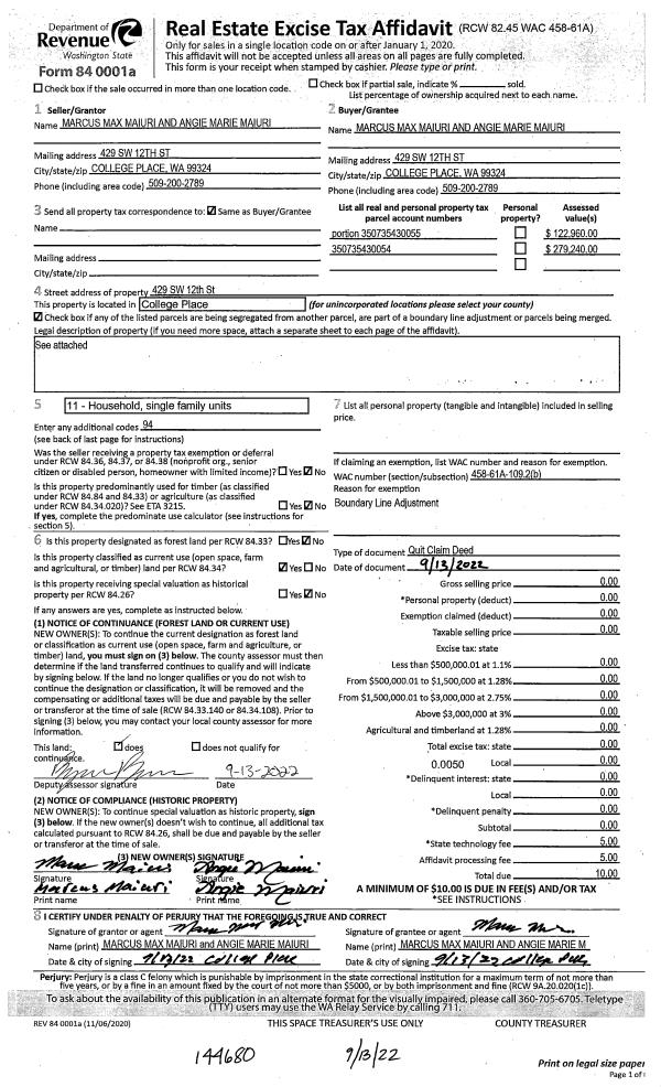 | 1 | 09/13/2022 | QCD | QUIT CLAIM DEED | MAIURI MARCUS MAX & ANGIE MARIE | MAIURI MARCUS MAX & ANGIE MARIE | | | | 144680 | 2022-07650 |