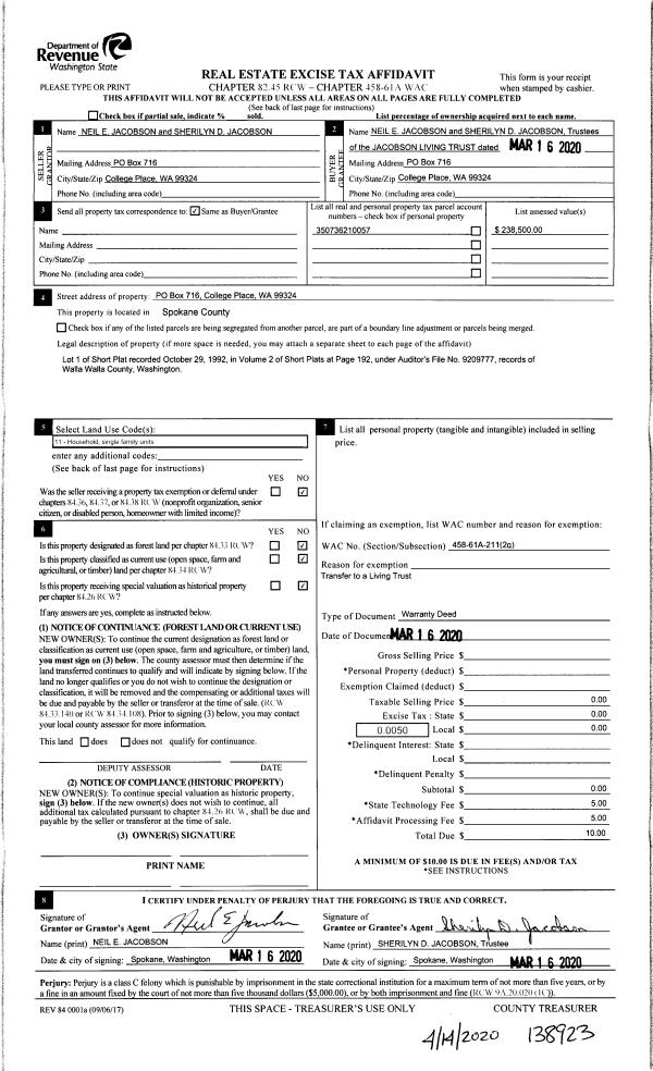 | 1 | 03/16/2020 | WARRANTY D | WARRANTY DEED | JACOBSON NEIL E & SHERILYN D | JACOBSON LIVING TRUST | | | $0.00 | 138923 | 2020-03170 |