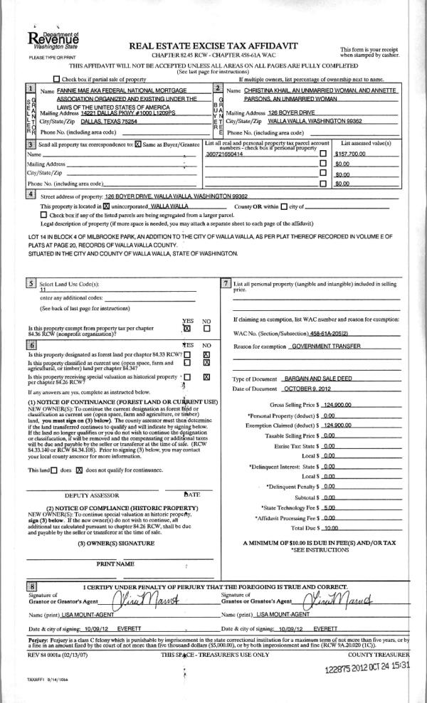 | 5 | 10/24/2012 | WARRANTY D | WARRANTY DEED | FEDERAL NATIONAL MORTGAGE ASSO | KHAIL, CHRISTINA | | | $124,900.00 | 122875 | 2012-09399 |