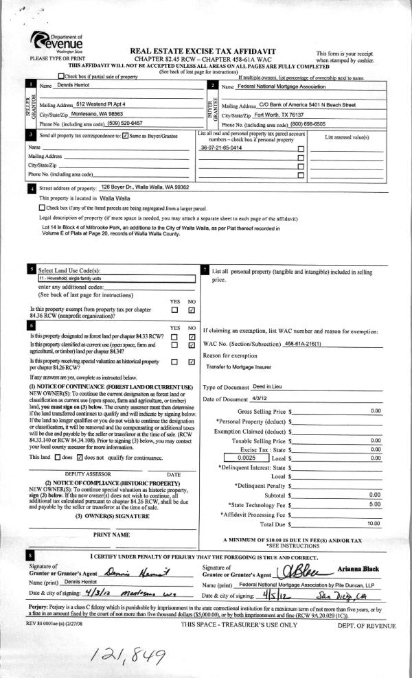 | 6 | 05/22/2012 | WARRANTY D | WARRANTY DEED | HERRIOT, DENNIS | FEDERAL NATIONAL MORTGAGE ASSO | | | $0.00 | 121849 | 2012-04197 |