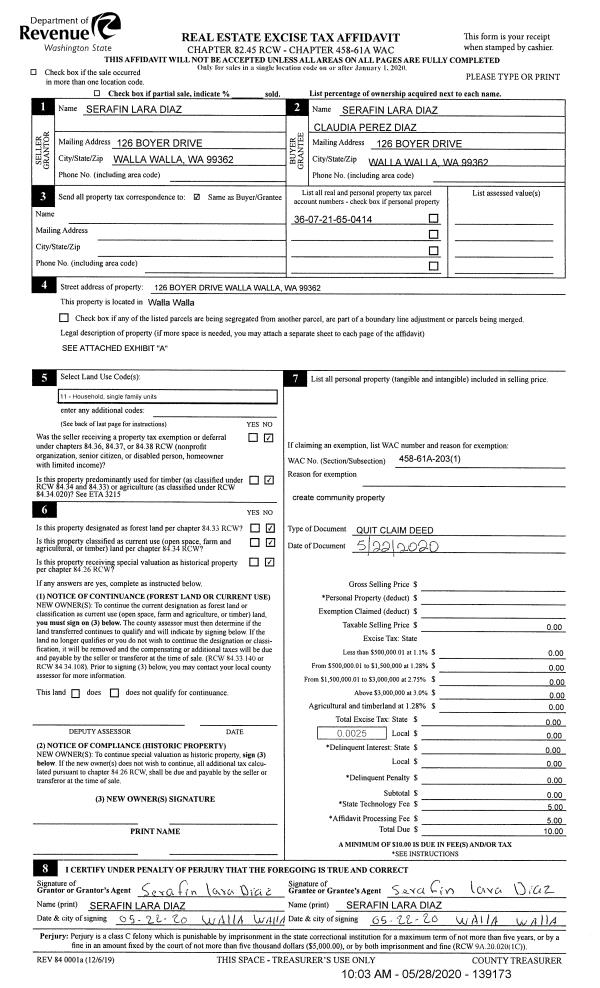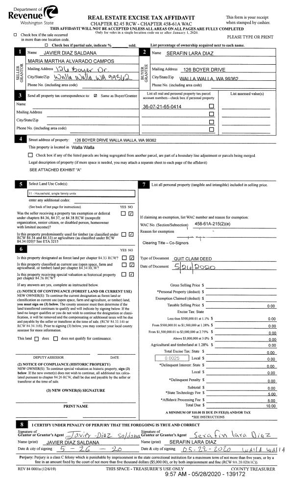| 2 | 05/26/2020 | QCD | QUIT CLAIM DEED | DIAZ SERAFIN LARA | DIAZ SERAFIN LARA | | | $0.00 | 139172 | 2020-04668 |